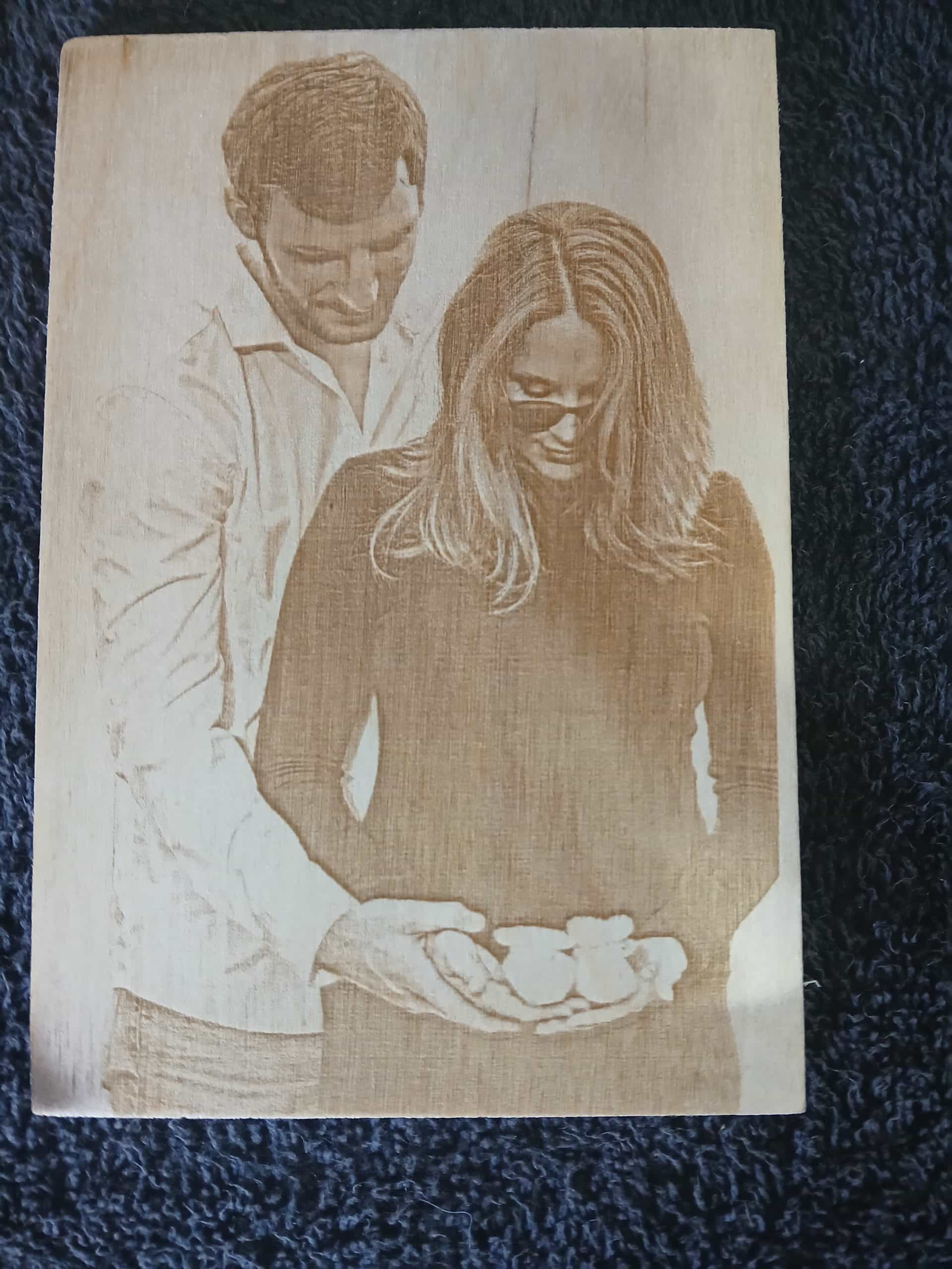 Celebrate the journey to parenthood with this exquisite laser-engraved photograph on wood, a tender keepsake, awaiting their little one. Etched onto a 150 x 210 mm slab of Birch Ply wood, the image captures the expectant couple in a serene moment.